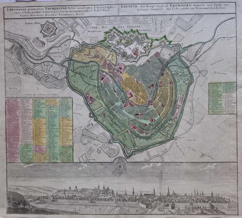Erfurth, Haupt Stadt in Thüringen, Orig. altkolorierter Kupferstich von Hommanischen Erben, 1743. Blatt 53 x 62 cm. Best.Nr. 7400. Großformatige Kupferstichkarte mit Stadtplan mit Index sowie Gesamtansicht von Erfurt unter dem Plan. Teilkoloriert, mit Mittelfalz, sehr guterhaltene, seltene Karte.
