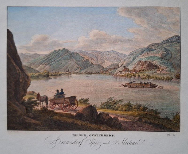 Blatt 38 x 52,5 cm, Bild 24 x 34,5 cm. Erstauflage.Best.Nr. 7452. Seltene große Erstausgabe. Schöne Ansicht mit der Gegend von Oberarnsdorf bis Spitz in der Wachau über die Donau gesehen. Auf der Donau einSchiff, im Vordergrund ein Fuhrwerk. Gut erhalten.