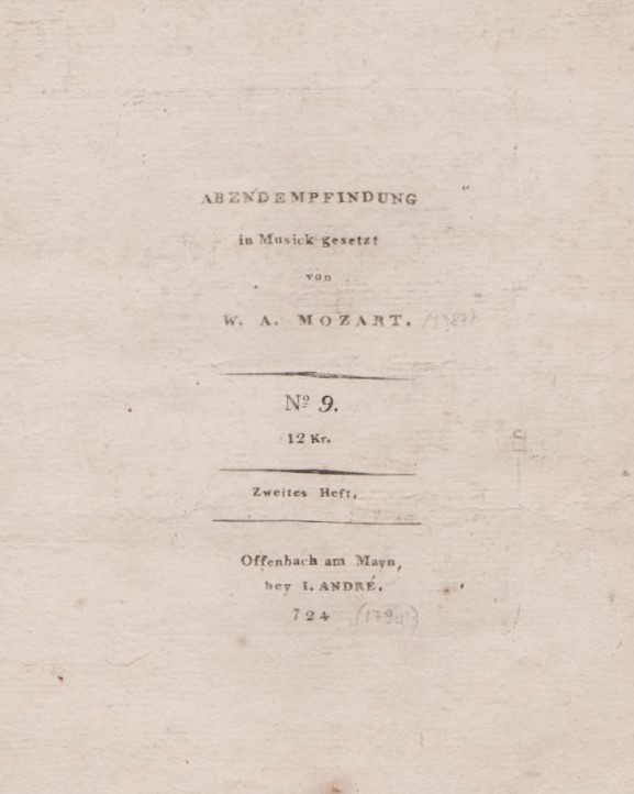 1) Abendempfindung in Musik gesetzt von W.A. Mozart. Gestochene Noten mit Text. Beigebunden: