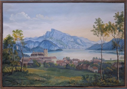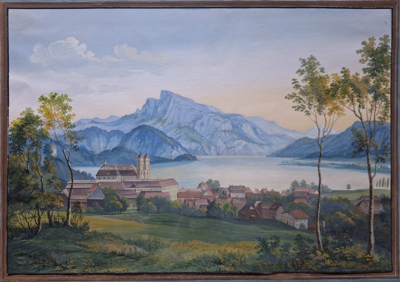 Best.Nr. 7406. Diese dekorative Gesamtansicht von Mondsee in Gouache - Technik ist Johann Baptist Schmid, Pfleger in Mondsee zugeschrieben. Das Bild zeigt