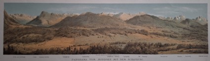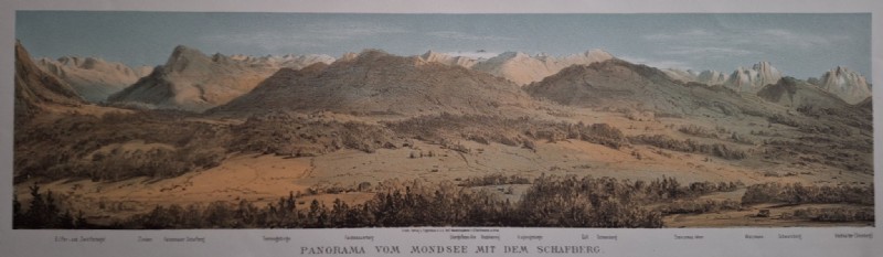 MONDSEE / SCHAFBERG PANORAMA.Orig.Farblithographie , um 1880. Wien, K.k. Hof-Kunstdruckerei v. G. Reiffenstein, ca. 1880. Das seltene Panorama reict vom Elfer u. Zwölferkogel, Zinken Faist. Schafbeerg Tennengebirge Hochkönig Göll Watzmann u. Hochkalter. Sehr gut erhalten.