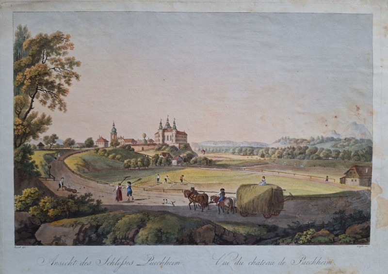Ansicht des Schlosses Puechheim (Puchheim). Altkolorierte Umrissradierung, von Ziegler nach Runk, 1810.