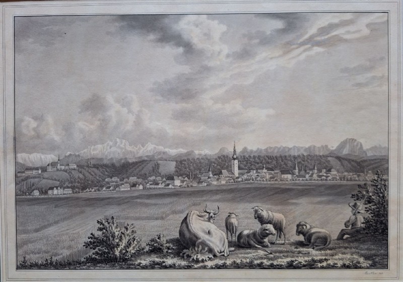Blick von Norden auf Schwanenstadt, Gesamtansicht in Grautönen, signiert Bertha, datiert (1)844. Blatt 35 x 47 cm, Bild 26 x 38 cm. Best.Nr. 7417. Große Gesamtansicht, im Hintergrund der Traunstein. Alte Ansichten von Schwanenstadt sind selten! Mit Schrägschnitt-Passepartout, gut erhalten.