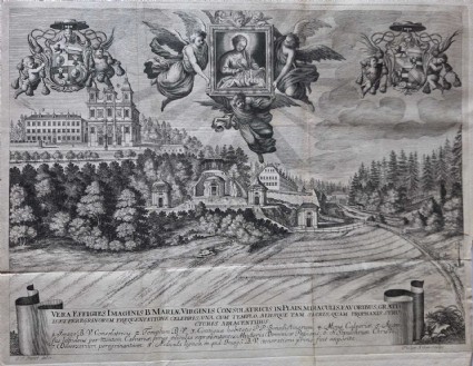 Frequentatione celebris, una cum templo, aliusque tam sacris, quam prophanis Structuris adjacentibus. … Orig. Kupferstichvon Philipp Kilian nach J.F. Perret (Pereth) , um 1692.