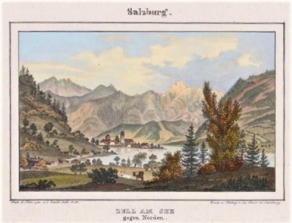 ZELL AM SEE gegen Norden. Kolorierte Lithographie v. Pezolt, 1838
