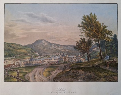 Salzburg vom Mönchsberg von oberhalb der Reitschule. Kolorierte Lithographie v. Th. Hellmuth nach Eugen Adam, 1836.Blatt 27 x 35 cm, Bild 20 x 28,5 cm. Erstauflage.Best.Nr.7497. Große Ansicht vom Mönchsberg über die Stadt Salzburg und auf den Gaisberg. Ansicht aus der seltenen Salzburg-Ansichten-Serie von TheodorHellmuth nach den Entwürfen vom Münchner Maler Eugen Adam. Nebehay/Wagner Nr.2.18. Mit Schrägschnitt-Passepartout. Sehr gut erhalten.