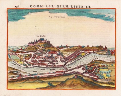 Saltzburg. Kolorierter Orig.Kupferstich von Salzburg aus "Comm.Rerum Germanicorum".