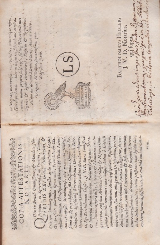 Catalogus. Cum Historiae Compendio Abbatum Monasterii S.Petri Salisburgi, Ex Antiquis Chronicis , Litteris, & Monimentis Authenticis, quae in dicto Monas terio asservantur, Extractus ab Alberto Abbate eiusdem Monasterii,...M.DC.XLVI. Mit 1 gedr. (Barth. Hegler) u. 1 gestempelten Notariatssignet (Math. Högg).