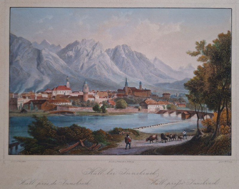 Hall bei Innsbruck. Kolor. Orig.Stahlstich von W.Lange nach F.Würthle. 1852.